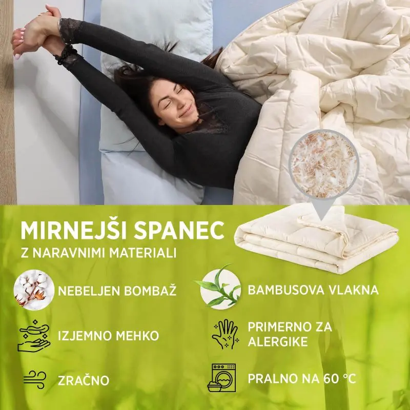 Polnilo vsebuje 80 % viskoze iz bambusa in 20 % mikrovlaken v skupni gramaturi 300 g/m2. Bambusova vlakna pomagajo uravnavati temperaturo, odvajajo odvečno vlago ter ustvarjajo bolj suho in sveže spalno okolje.