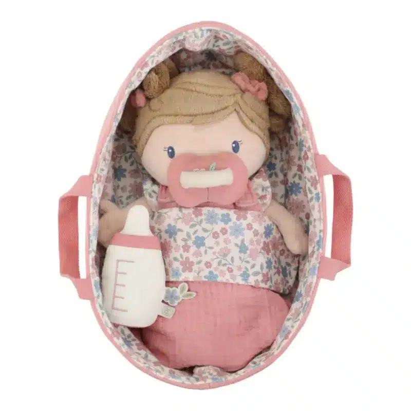 Punčka Rosa ima priloženo dudo in stekleničko, ki se s pomočjo magneta enostavno pritrdita na njena usta, kar dodatno obogati igro. Priložena mehka košara z veselimi cvetličnimi vzorci in priročnimi ročaji omogoča enostavno prenašanje, zato je Rosa vedno lahko ob otroku – doma ali na poti.