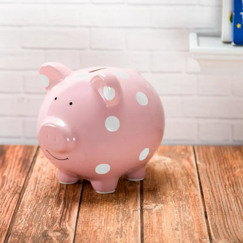 Prisrčen keramični hranilnik v obliki roza pujska, ki otroke spodbuja k varčevanju in hkrati služi kot dekoracija otroške sobe.