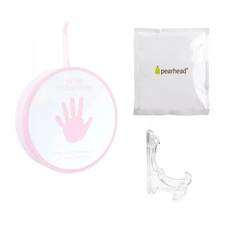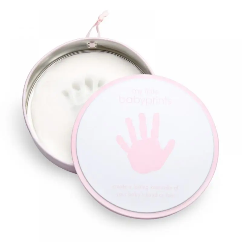 Set za ustvarjanje odtisa dojenčkove roke ali noge v roza škatlici. Enostaven za uporabo, varen in idealen kot trajen spomin ali darilo.